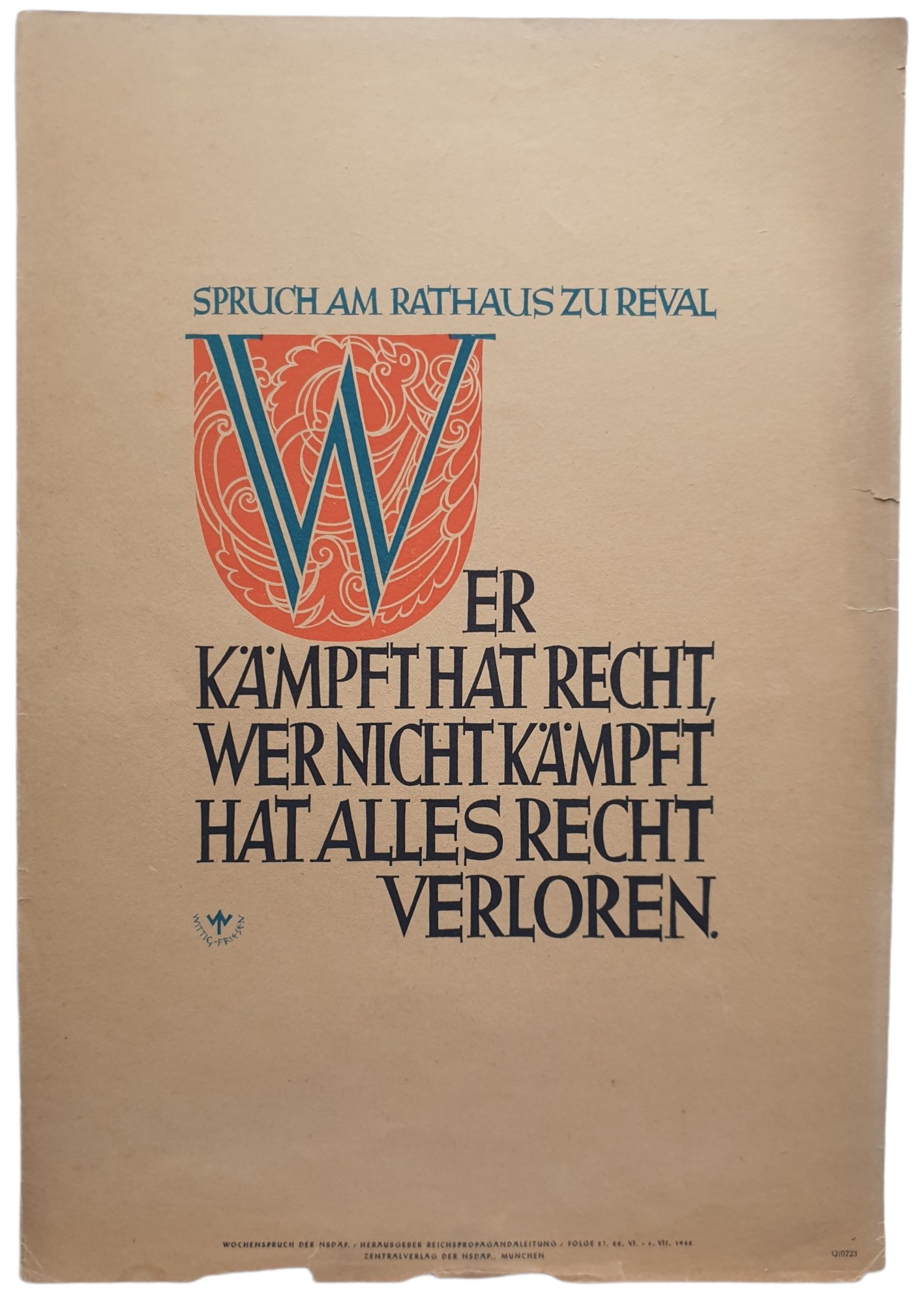 NSDAP Wochenspruch 1942 folge 27 ''Wer kampft hat recht wer nicht kampft hat alles recht verloren.''35 x 24 cmDamaged at the bottom.NSDAP Wochenspruch 1942 folge 27 ''Wer kampft hat recht wer nicht kampft hat alles recht verloren.''35 x 24 cmBeschadigd aan de onderkantProductnummer: 0040431