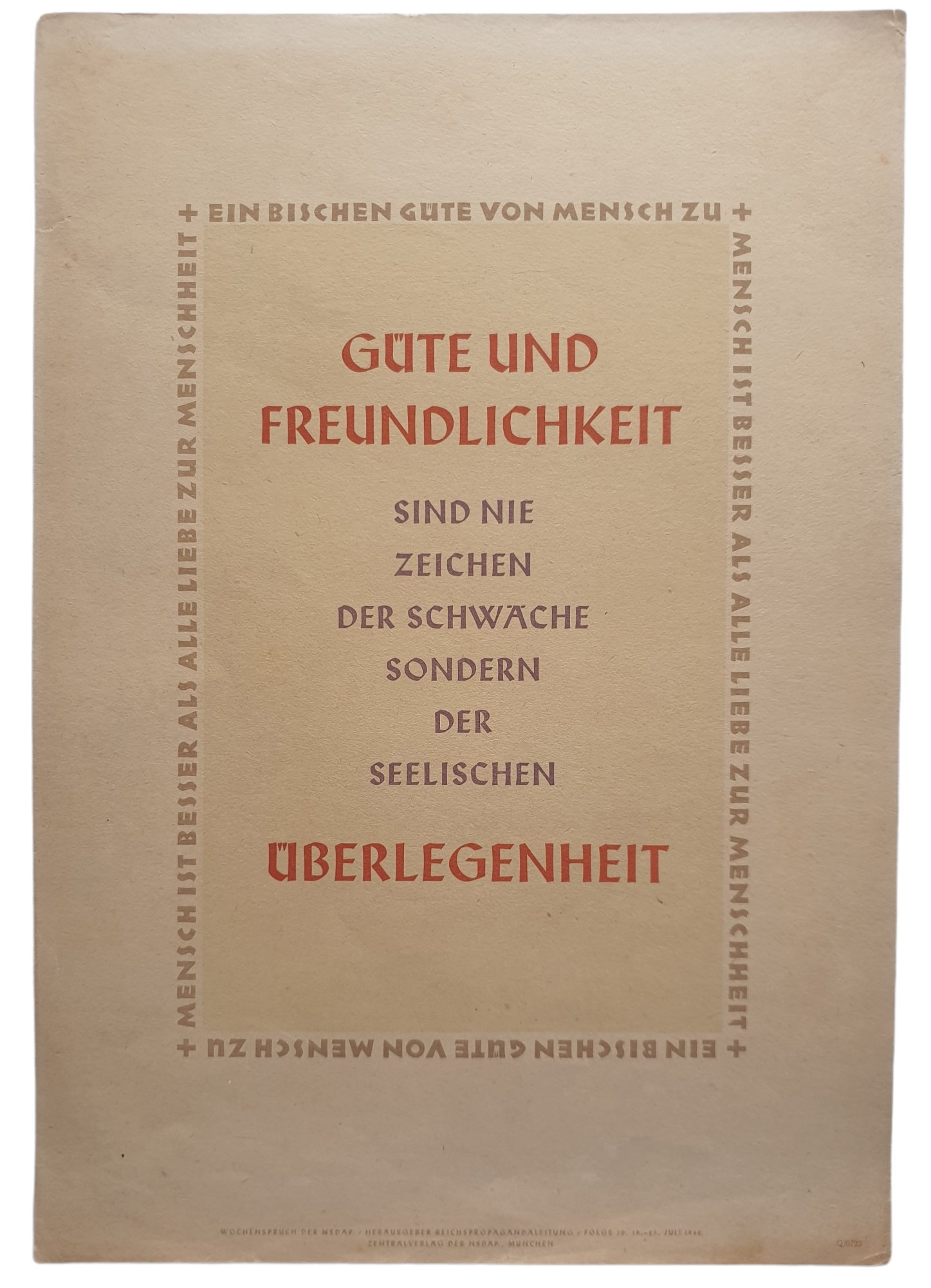 NSDAP Wochenspruch 1942 folge 30 ''Gute und freundlichkeit sind nie zeichen der schwache sondern der seelisten uberlegenheit.''35 x 24 cmNSDAP Wochenspruch 1942 folge 30 ''Gute und freundlichkeit sind nie zeichen der schwache sondern der seelisten uberlegenheit.''35 x 24 cmProductnummer: 0040434