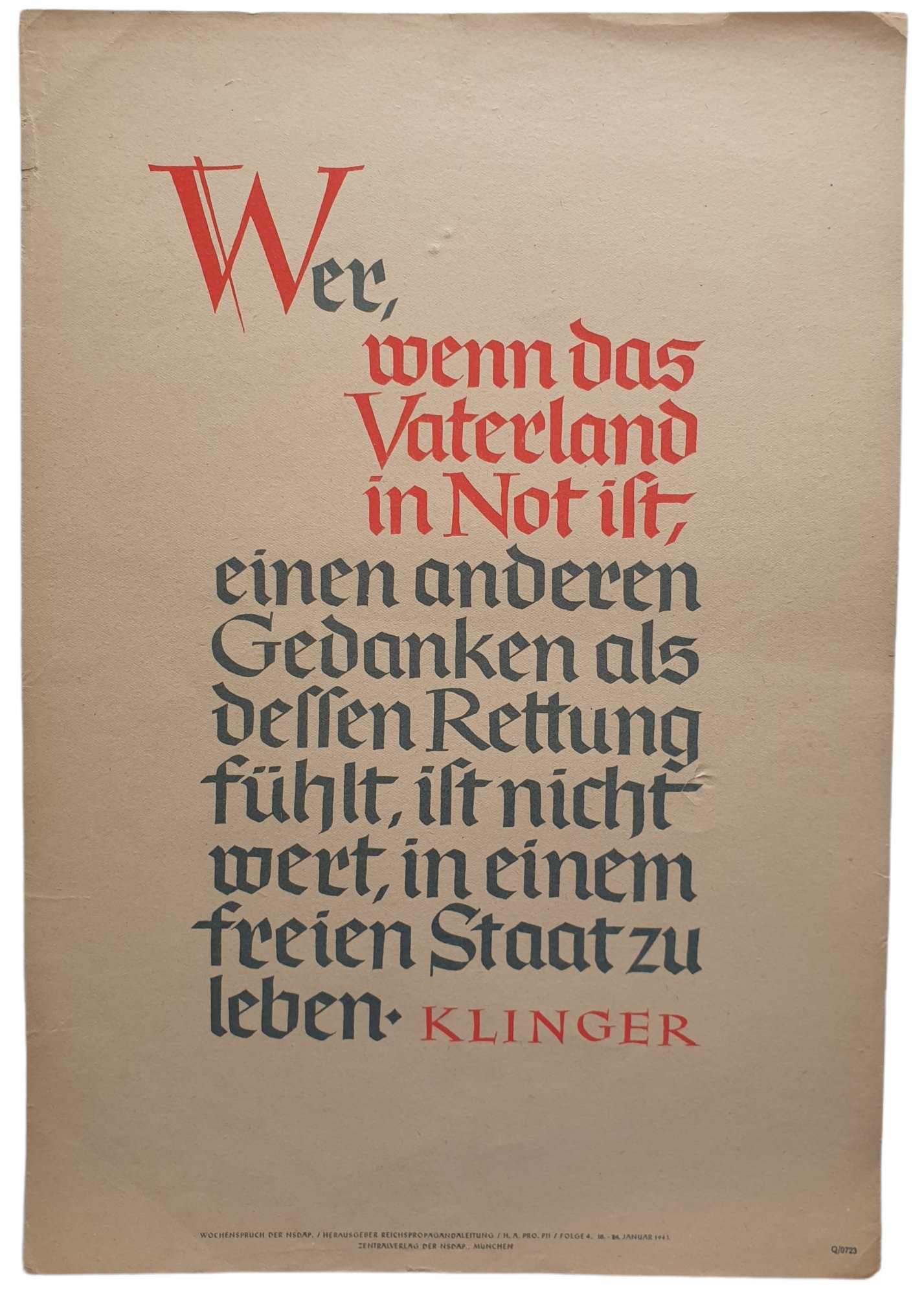 NSDAP Wochenspruch 1943 folge 4 byFriedrich Maximilian Klinger.'Wer, wenn das Vaterland in not ist, einen anderen gedanken als dessen rettung fuhlt, ist nicht wert, in einem freien staat zu leben.''35 x 24 cmNSDAP Wochenspruch 1943 folge 4 doorFriedrich Maximilian Klinger.'Wer, wenn das Vaterland in not ist, einen anderen gedanken als dessen rettung fuhlt, ist nicht wert, in einem freien staat zu leben.''35 x 24 cmProductnummer: 0040445