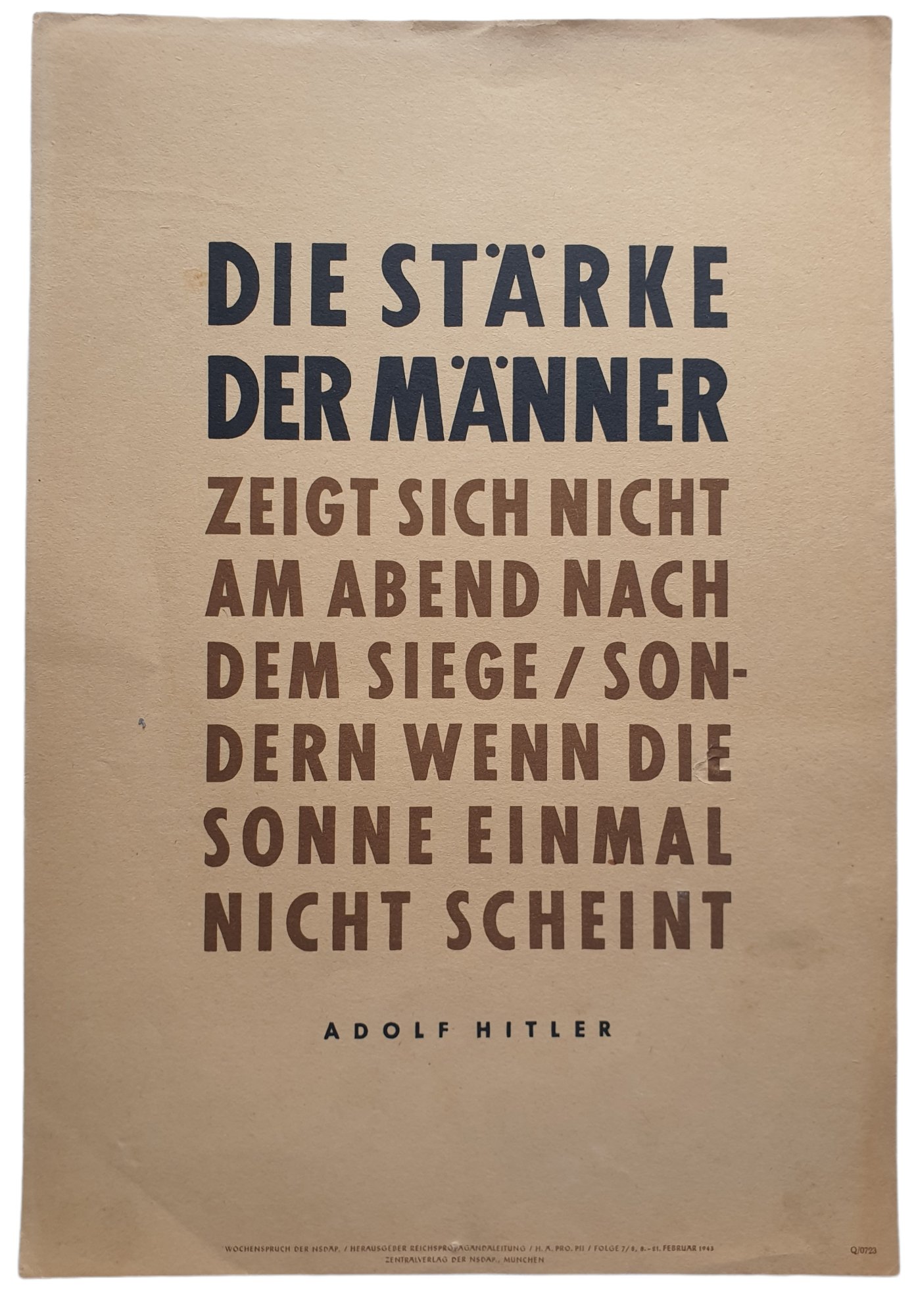 NSDAP Wochenspruch 1943 folge 7/8 by Adolf Hitler. ''Die starke der manner zeigt sich nicht am abend nach dem siege / sondern wenn die sonne einmal nicht scheint.''35 x 24 cmNSDAP Wochenspruch 1943 folge 7/8 door Adolf Hitler. ''Die starke der manner zeigt sich nicht am abend nach dem siege / sondern wenn die sonne einmal nicht scheint.''35 x 24 cmProductnummer: 0040446