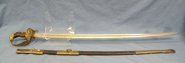 Original era manufacture. British influenced sword with an Italian retailers name on the blade spine. 28 inch chrome steel blade with etched panels on each side of the blade, one of which dispalys a Star & Crescent symbol. Gilded brass lionhead hilt with a folding brass guard decorated with a fouled anchor and three stars. Dark brown wooden grip with triple wire binding. Brass mounted black leather scabbard, sound stitching but the upper & lower suspension ring fittings are loose. At some point in time the suspension fittings were reversed on the sword, these need to be reversed for proper display. Sword displays normal age and wear, no damage.
