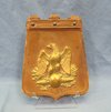 Original era manufacture. Brown calfskin covered Sabretache with a large brass eagle plate on its cover. The interior has a small pocket, three brass suspension loops at top.