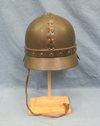 Original era manufacture. Heavy molded fibre helmet in dark olive green color. The shape reminds me of an old Samurai helmet. Riveted together with very prounounced front and rear visors. Thick painted cloth lining with a blue cloth interior padding. The chinstrap is missing on one side. Great looking helmet.