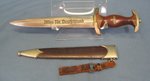 Original era manufacture. Early pattern dagger with nickel fittins and an anodized scabbard body. The blade is quite bright, lots of original polish and has not been cleaned or polished in a long time. Interesting makers mark of two hobby horses on the ricasso along with the name ASSO Solingen. Sound wood grip with no chips or major dings, thin vertical stain on the front of the grip. The scabbard body shows traces of original lacquer with good color beneath, flattened ball tip as usual. Honest, out-of-the-woods dagger.