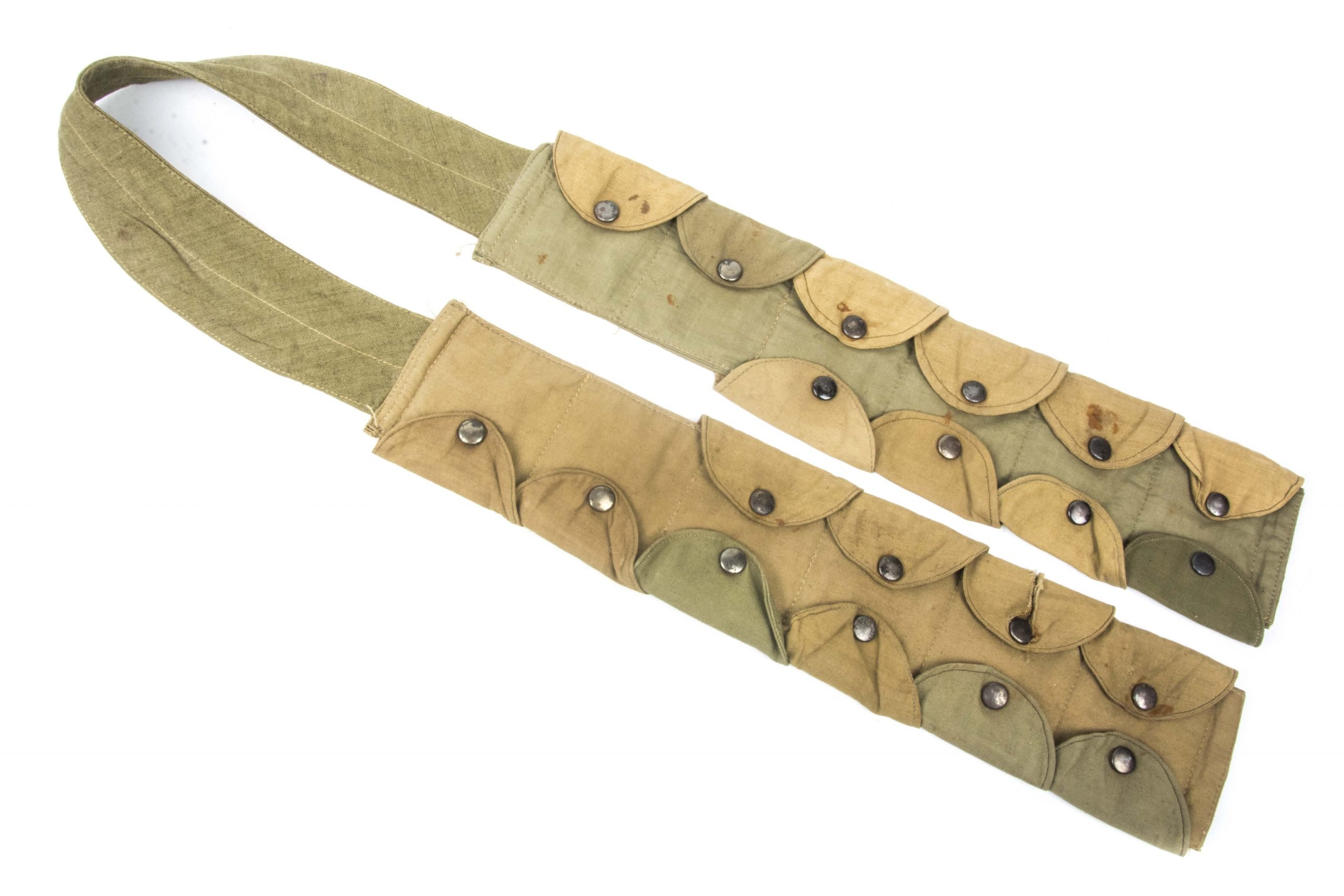 A nice original late war tan Fallschirmjäger bandoleer in good used condition. A typical example with many different materials used. A small damage to one of the flaps, other then that a nice used example with all press studs in working condition!