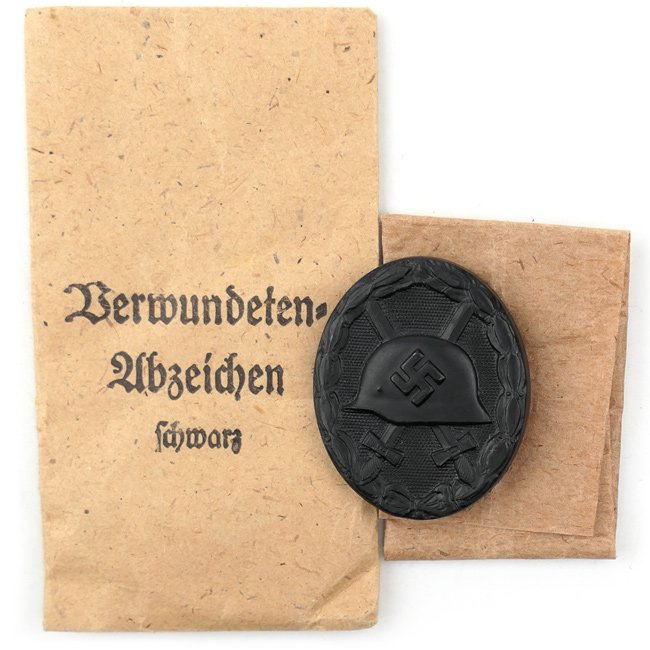 Black Wound Badge (Verwundeten Abzeichen in Silber) with Pouch. With the outbreak of World War 2, on 1 September 1939, Hitler re-instituted a slightly modified version of the wound badge by altering the WWI pattern helmet on the badge to the newly designed M35 style helmet. The badge was awarded to both military and uniformed non-military personnel and later, (March 1943), to civilian personnel who received wounds as a result of enemy actions. This is a nice black grade wound badge, the magnetic steel type wound badge is nicely maker marked with number 'L55' indicating production by the company of 'Wächtler & Lange' from Mittweida. The pin and catch are complete and functional. The badge is complete with its paper tissue and matching carton pouch as found together, matching marked with LDO number 'L55'. Rare original set in good unissued condition.