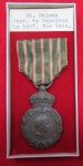 Original era manufacture. The first French campaign medal, created in 1857 by Napoleon III to honor those surviving veterans of the Grande Armee who served between 1792 and 1815. It is believed over 405,000 veterans received this award at the time. Original dark bronze patina with its correct ribbon. The period image below is not included, however it illustrates the importance and honor the Saint Helena medal conveyed to the surviving veterans of the Wars of Napoleon. A similar medal is being worn by the the last surviving veteran of Waterloo, Victor Baillot, taken in 1897 when he was 105 years old. The Saint Helena Medal can be clearly be seen on the lapel of his coat.