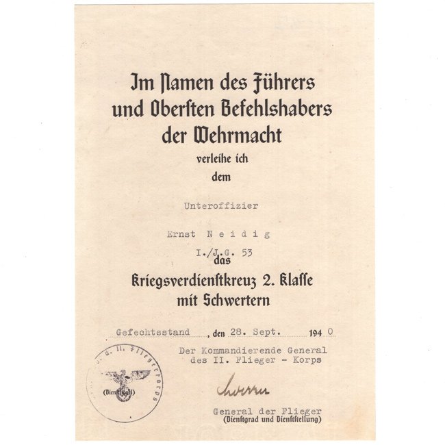 This is an Award Document (Urkunde) for the War Merit Cross 2nd Class with Swords (Kriegsverdienst Kreuz 2. Klasse mit Schwertern). The War Merit Cross was instituted by Adolf Hitler on 18 October 1939. This DIN-A5 sized document was awarded to Unteroffizier 'Ernst Neidig', he was a member within 'I./J.G. 53' (1. Jagd Geschwader 53), known as the 'Pik As' (Ace of Spades) Geschwader which included many famous flying aces like 'Werner Mölders' and 'Erich Hartmann' amongst many others. This document was handed to him on 28 September 1940. This award document has been personally signed by General der Flieger 'Bruno Loerzer', Der Kommandierende General des 2. Flieger - Korps. Loerzer was a recipient of the Knight's Cross of the Iron Cross. The award document is in excellent, unfolded condition, see scans. Nice original award document.