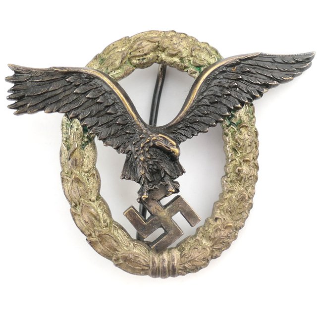 Luftwaffe Pilots Badge (Flugzeugführerabzeichen). The Pilot's badge was originally introduced in january 1935 as an DLV (Deutsche Luftsport Verband) award, the Luftwaffe officially adopted the award on 26 march 1936 by order of 'Hermann Göring'. The badge was awarded to Luftwaffe personnel who completed the theory and training and achieved their military pilot's licence. This badge is a nice early war example made of tombak (Buntmetall), this is a so-called J2 type. The badge is nicely maker marked by the company of 'C.E. Juncker' in Berlin SW. The badge shows very nice & pronounced detail overall having a nice darkened age patina. The badge has naturally a functional pin & catch construction. Desirable original pilot's badge.