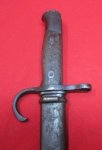 Original era manufacture. An early production bayonet which is numbered on the blade tang rather than the pommel as usually seen. Fullered blade, hooked guard, rounded bird head pommel and contoured wood grips. The blade exhibits a dark patina finish, but no real corrosion issues or pitting. Dark steel patina finish to the guard and pommel. Original finish wood grips exhibiting the typical dings and dents from service use. Fairly dent-free steel scabbard exhibiting a mix of blue and steel patina with patches of surface corrosion.