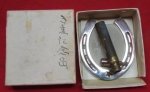 Original era manufacture. Well made all metal paperweight, featuring a horseshoe and a 7.7 casing and spent projectile. First time we have ever had one of these in it's original box. Corrosion staining to the top of the casing, otherwise normal age and wear.