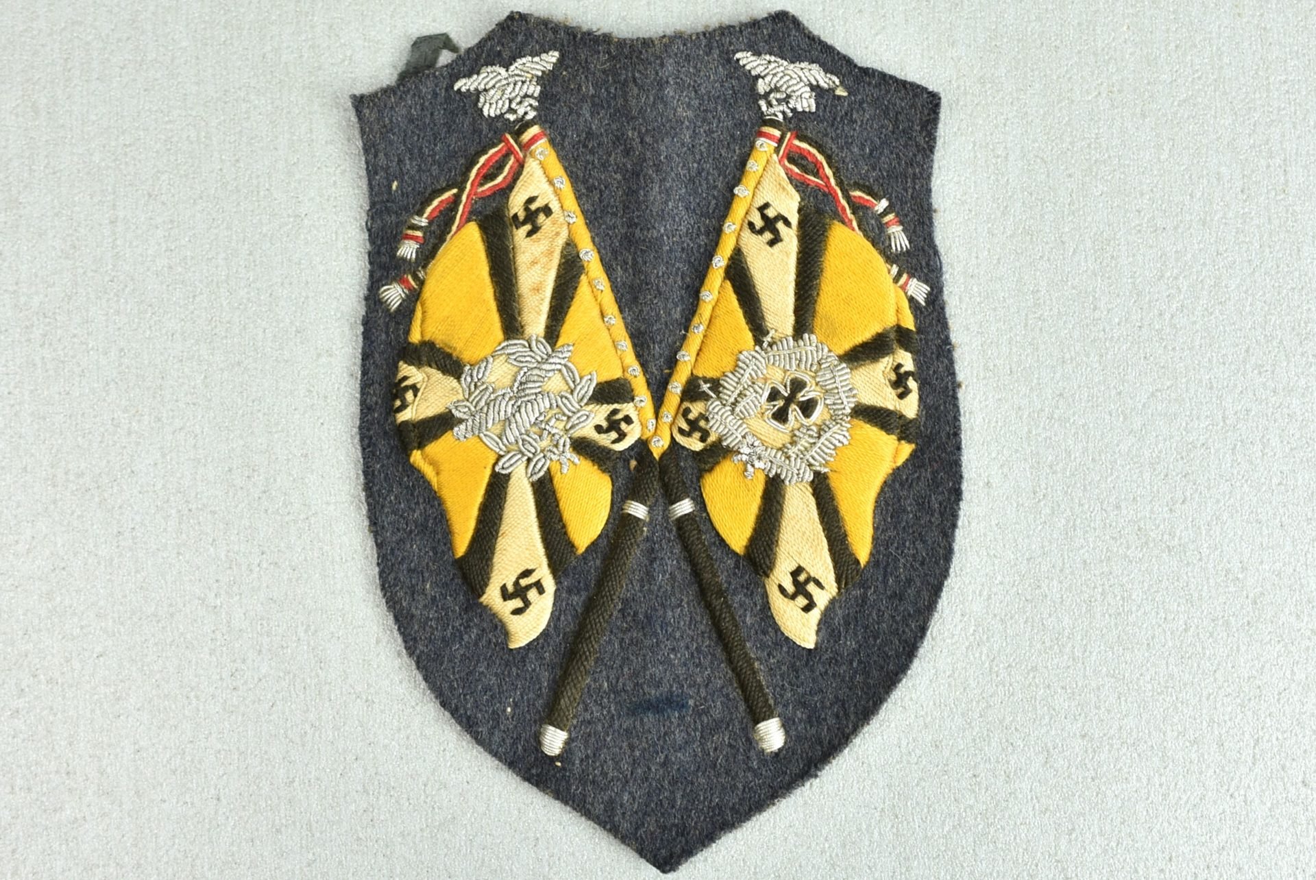 Seldom seen and very desirable Luftwaffe Fahnenträger sleeve patch. The patch was actually worn and is a uniform removed piece, unlike all the mint ones you see. The embroidery is just perfect and the patch would be an eyecatcher in any collection. The yellow color on the flag means it was issued to flying personnel (pilots units etc…). On top of that, it is the first example I encounter that actually has a maker mark on the reverse; H&S.