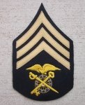Original period manufacture. Individually sewn buff color chevrons on fine quality dark blue wool; below is a beautifully embroidered Quartermaster insignia, facing left, worn in pairs, left side.See Chapter 6, pages 226-231, catalog 200, US Army Soldiers And Their Chevrons, LTC W.K. Emerson.