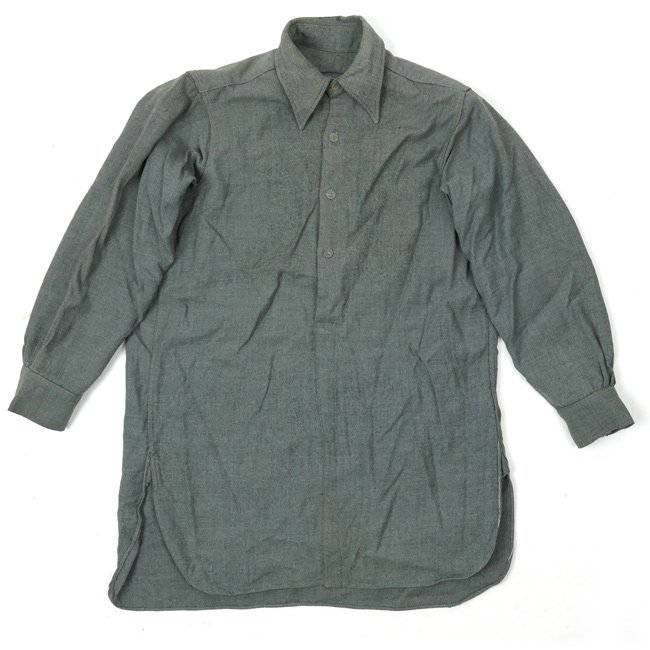 Wehrmacht (Heer)/Waffen-SS Shirt (Hemd). Type shirt without breast-pockets. The shirt is constructed of (field)grey coloured Italian type wool. Complete with all carton type buttons. The shirt is not visible maker marked or dated. Hard to find original shirt in very good condition, perfect to complete your mannequin with.
