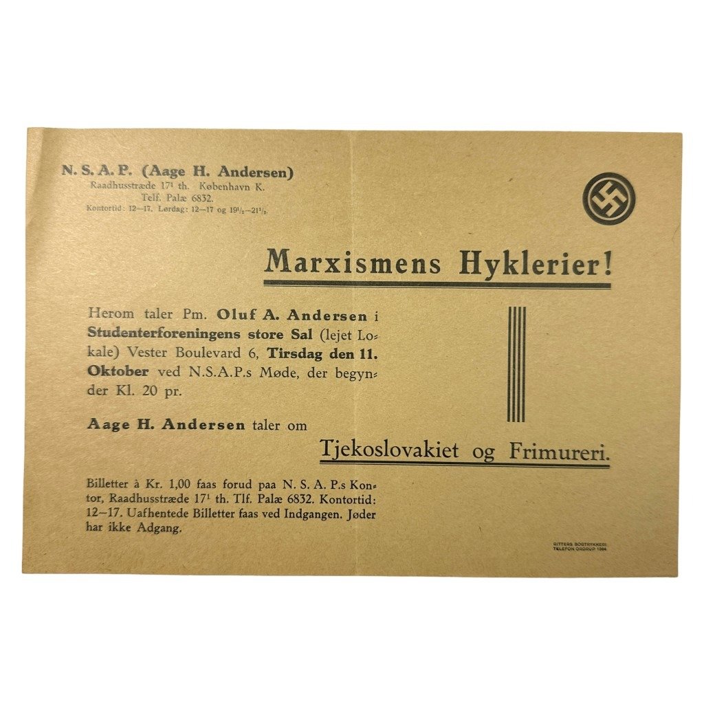 This Danish N.S.A.P. flyer is in good condition and announced that Aage H. Andersen would be speaking in Copenhagen.