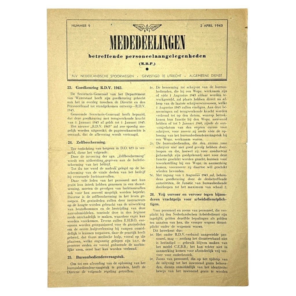 This announcement sheet is in good condition, dated April 2, 1943 and was printed for the staff of the Dutch Railways.
