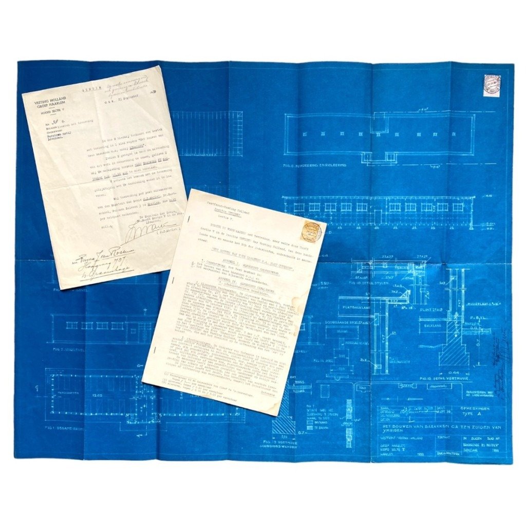 This Dutch set comes from the Dutch bunker builder J. van Rossum, who was commissioned in September 1939 by the Ministry of Defense to build two army barracks at IJmuiden.The set consists of the original blueprint of the barracks, a secret letter from Captain of the Engineers J.J. Marlet and the associated specifications with conditions.Blueprint dimensions: 74 x 59 cm.A very unique set for the Dutch army collection or regional collector!Article number: 13926Originele WWII Nederlands leger set barrakken bouwplannen voor IJmuidenDeze Nederlandse set is afkomstig van de Nederlandse bunkerbouwer J. van Rossum hij kreeg de opdracht in september 1939 van defensie om twee leger barakken te bouwen bij IJmuiden.De set bestaat uit de originele blauwdruk van de barakken, een geheime brief van Kapitein der Genie J.J. Marlet en de bijbehorende bestek met voorwaarden.Afmetingen blauwdruk: 74 x 59 cm.Een zeer unieke set voor de Nederlands leger collectie of regionale verzamelaar!Artikelnummer: 13926