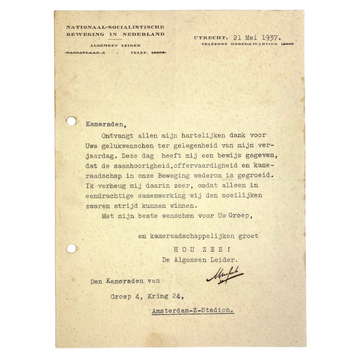 Ontvangt allen mijn hartelijken dank voor Uwe gelukwenschen ter gelegenheid van mijn verjaardag, deze dag heeft mij een bewijs gegeven dat de saamhoorigheid, offervaardigheid en kameraadschap in onze Beweging wederom is gegroeid.
