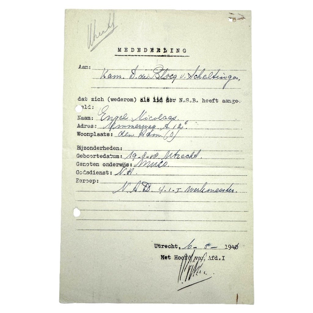 Original WWII Dutch NSB re-registration document Den Ham/Utrecht