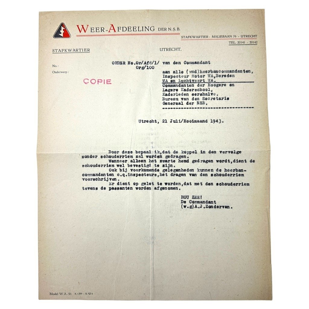 Original WWII Dutch NSB W.A. letter from Zondervan about wearing the NSB shoulder strap