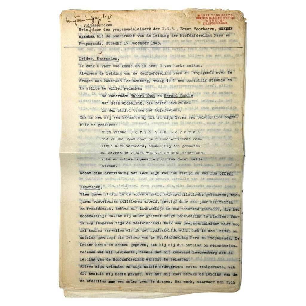 Originele WWII Nederlandse NSB speech opgesteld door Ernst Voorhoeve