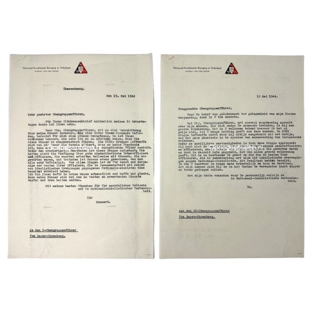 These two NSB letters come from NSB leader Anton Mussert and were sent to SS-Obergruppenführer Von Bayer-Ehrenberg on May 19, 1944.