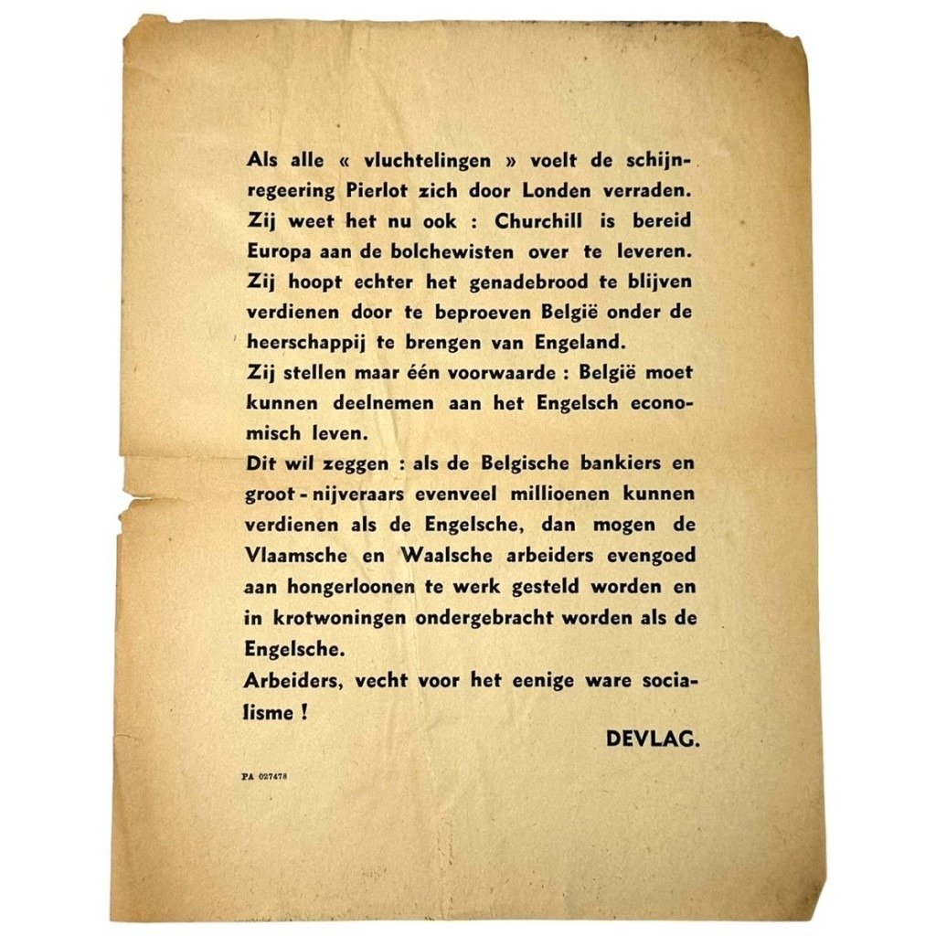 This Flemish collaboration flyer is in used condition, contains Anti-English propaganda and was used by the Flemish collaboration organization Devlag.