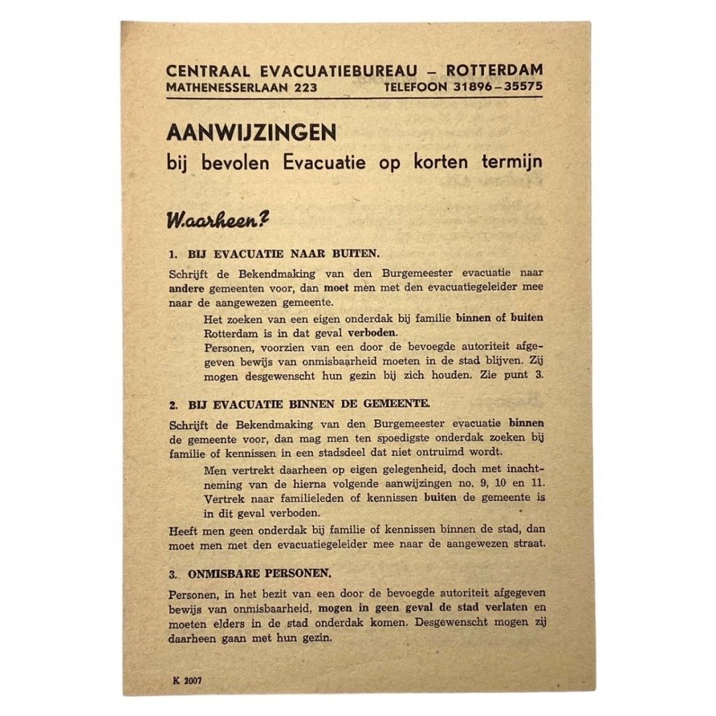 This Dutch flyer is in good condition and contains information regarding evacuations from Rotterdam.
