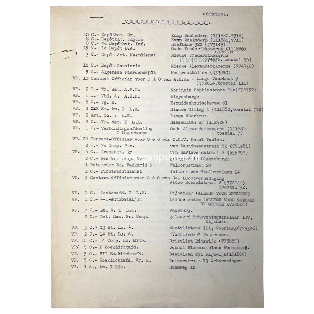 This list contains all kinds of addresses from The Hague and its surroundings and on it was listed where the Dutch army units were located.