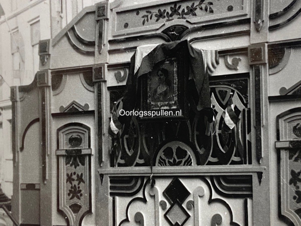 Subject: A barrel organ with the portrait of the Dutch Queen during the liberation of The Hague in May 1945.