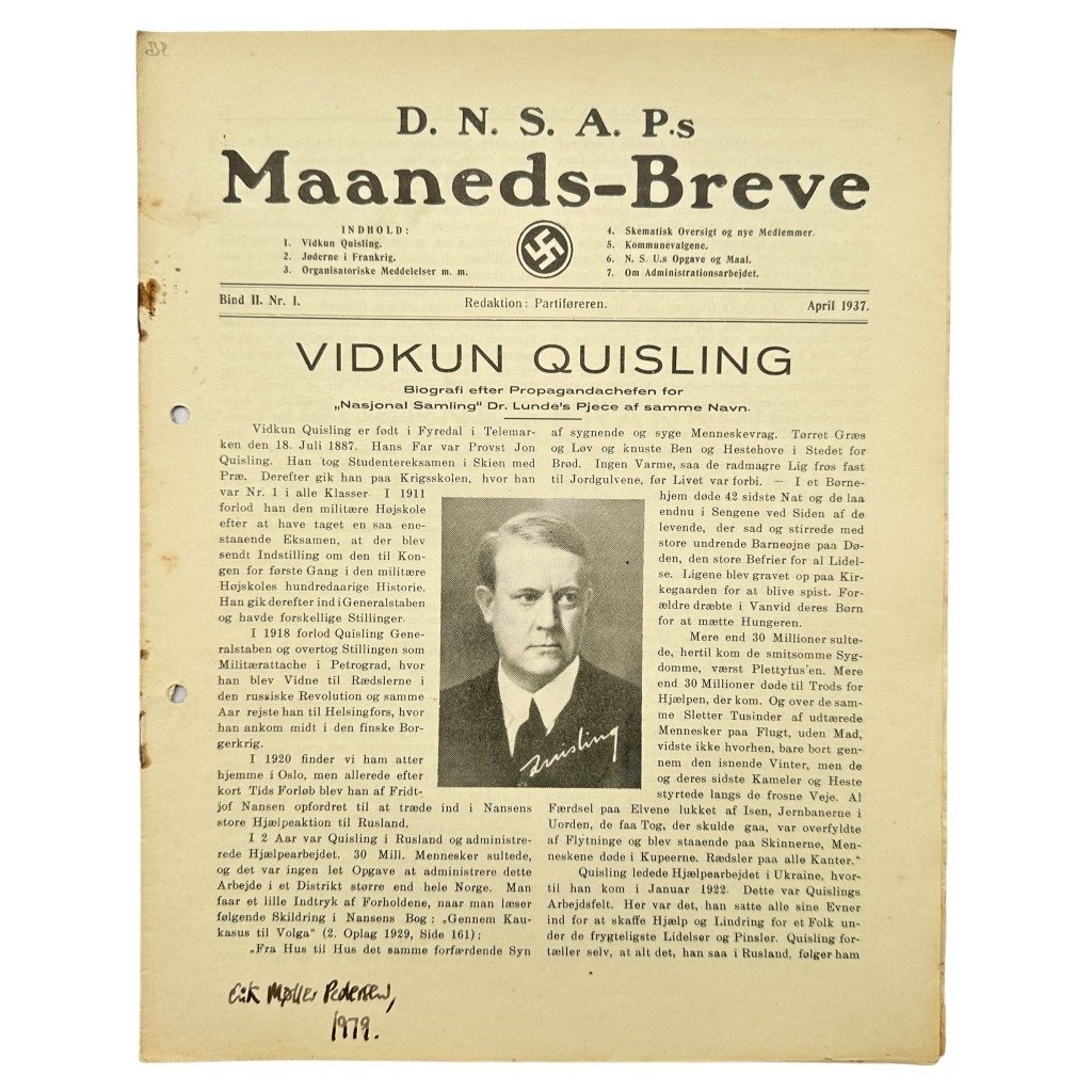 The magazine is in good condition and it is a Maaneds-Breve from the Danish collaboration party DNSAP.Edition: Nr 1 – April 1937The magazine contains information about the DNSAP, political ideas and party.A rare magazine for the collaboration or World War II collection!Article number: 12940
