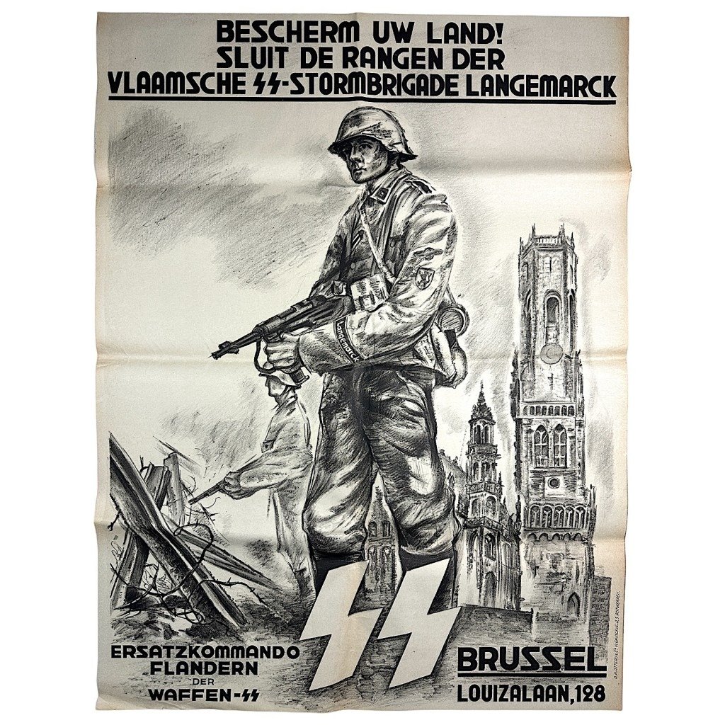 The Waffen-SS volunteer poster is in good condition and it was used to recruit Flemish volunteers for the SS Stormbrigade 'Langemarck' in Belgium.Text: Bescherm uw land! Sluit de rangen der Vlaamsche SS-Stormbrigade Langemarck.(English: Protect your country! Close the ranks of the Flemish SS Storm Brigade Langemarck)This SS poster was printed by O. Platteau & Co Vleminckveld in Antwerp.Measurements: 81 x 61 cm.A very rare and decorative Belgian SS volunteer poster for the collaboration or World War II collection!Article number: 12641