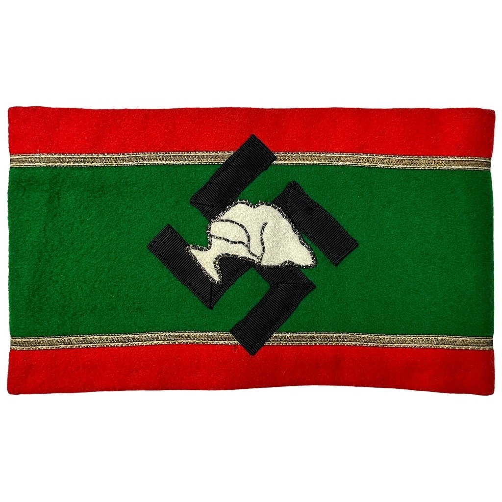 This Hungarian collaboration armband is in good condition and was worn by a member of the Magyar Nemzeti Szocialista Földmunkás és Munkáspárt, (MNSZFMP) which is also known as the Hungarian National Socialist Workers and Farmers Party.The armband is produced from red and green wool, a black swastika and on it the country of Hungary.This symbol was used until 1933! The group was founded on July 16, 1932 or so this armband was only in use by this early facist party for six months!Unique to the collaboration or armbands collection!Article number: 12232