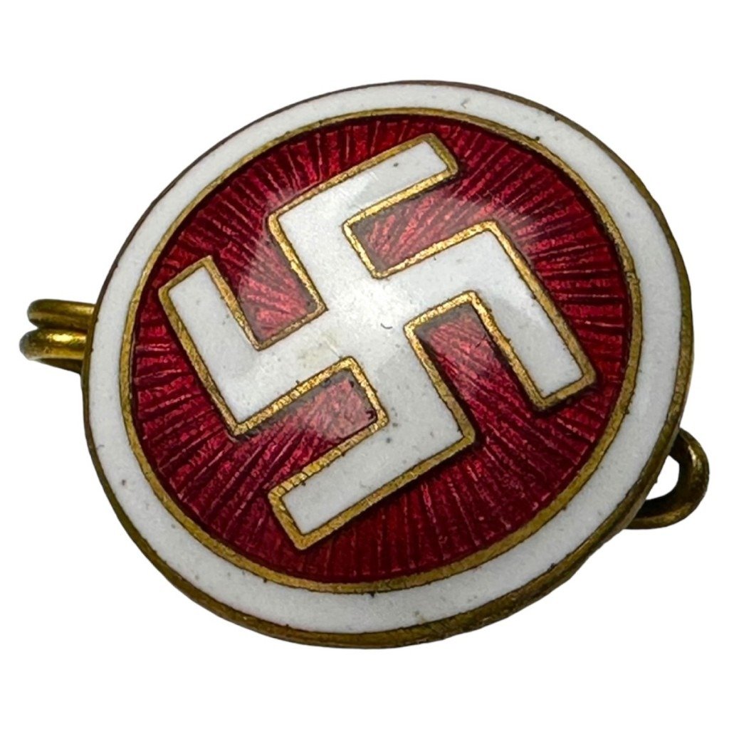 This Danish enameled DNSAP (Danmarks Nationalsocialistiske Arbejderparti) member pin is in good condition and this pin features red and white enamel and the swastika.