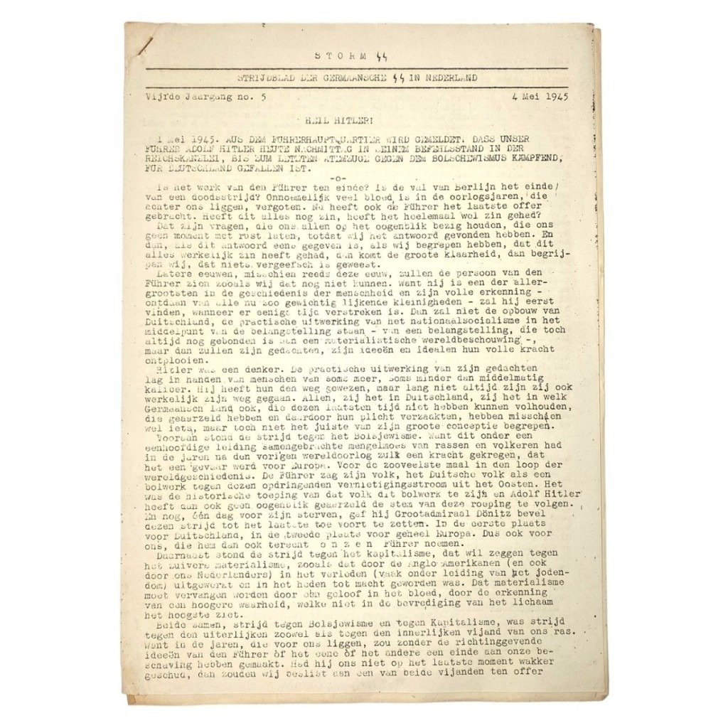The Dutch Storm SS newspaper is in good condition and it is the last printed edition of May 4, 1945.