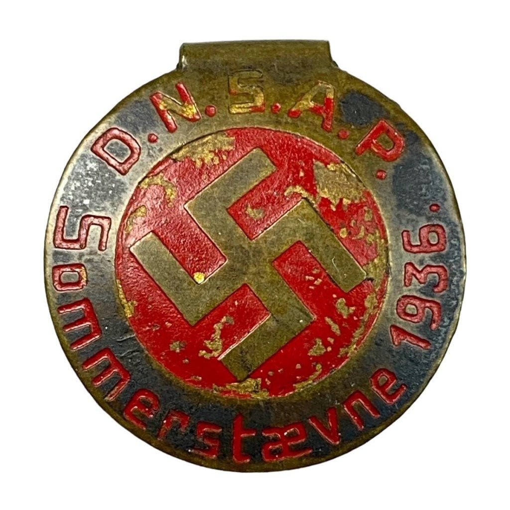 This DNSAP (Danmarks Nationalsocialistiske Arbejderparti) pin is in used condition and was used during the National Convention in Odense, Denmark in 1936.During this DNSAP event there were only a few hundred visitors present and that is the reason why this pin very scarce and hard to find!This is a buttonhole type of pin and it has the inscription: DNSAP Sommerstævne 1936 (Translation) DNSAP Summer meeting 1936.A very rare pin for the Danish collaboration collection!Article number: 10552