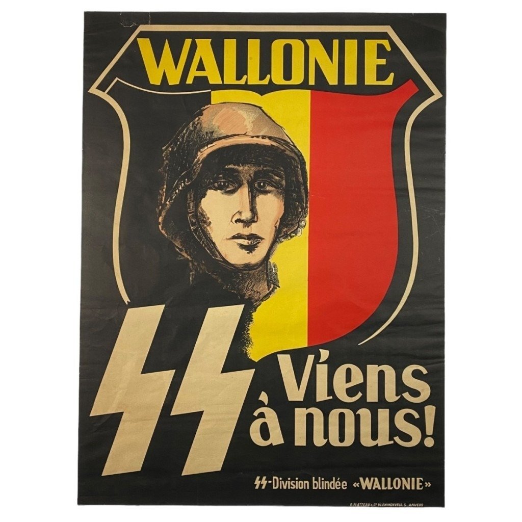 The poster is in used condition and was used to recruit Walloon volunteers for the Walloon Waffen-SS volunteer legion.Printer: O.Platteau & Co. in Antwerp (Belgium)Dimensions: 80 x 59 cm.On July 6, 1941, Leon Degrelle announced the creation of the 'Légion Wallonie.Immediately Degrelle began a tour of Wallonia to recruit volunteers. In his speeches, he called for participation in 'a crusade against godless Bolshevism,' and he spread the rumor that he had the tacit support of King Leopold III of Belgium.At the first rallies, only 850 volunteers reported for the legion.During the fighting in the winter of 1941, the ranks of the legion were greatly depleted.The German army leadership considered disbanding the unit.Leon Degrelle was determined to prevent this, as it would lower his prestige.In February 1942, he sent a legionnaire to Rex's leadership with the task of recruiting a new batch of volunteers.Reports of hardships on the Eastern Front deterred many volunteers and few new recruits showed up.The Walloon Legion fought against partisans in Ukraine, Cherkassy and the Battle of Tannenberg, among others.An interesting Walloon Waffen-SS poster for the collaboration or poster collection!Article number: 9907
