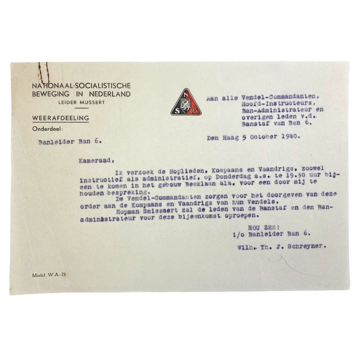 De NSB brief is in goede conditie en werd verstuur dop 5 oktober 1940 door NSB Banleider (Ban 6) Schreyner.