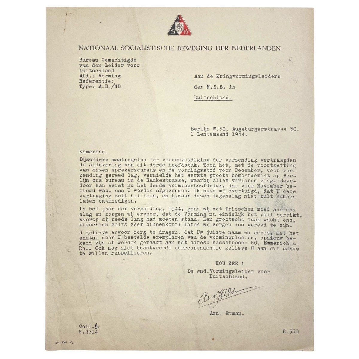 De NSB brief is in gebruikte conditie en afkomstig van de wnd. Vormingsleider voor de NSB in Duitschland Arn. Etman.