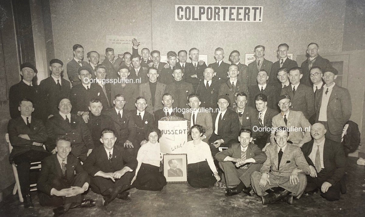 Een komisch detail, één van de NSB leden heeft een NSB sluitzegel op zijn gezicht geplakt.