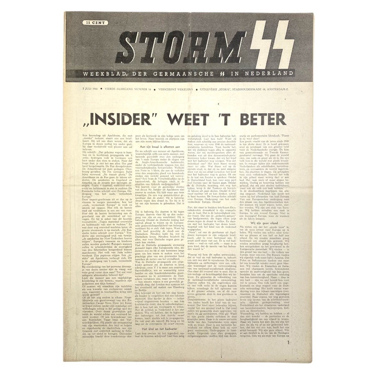 The Storm SS newspaper is in good condition and was known as the weekly newspaper der Germaansche SS in the Netherlands.Edition: July 7, 1944.The weekly was first published on April 11, 1941 and the last issue was printed on May 4, 1945.Perfect for the collaboration or World War II collection!Article number: 8741