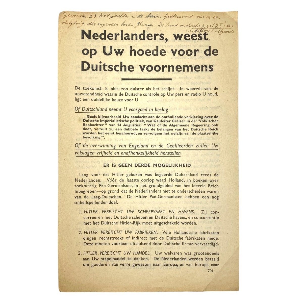 The dropping flyer is in good condition and was produced by the Allies and distributed over the Netherlands.
