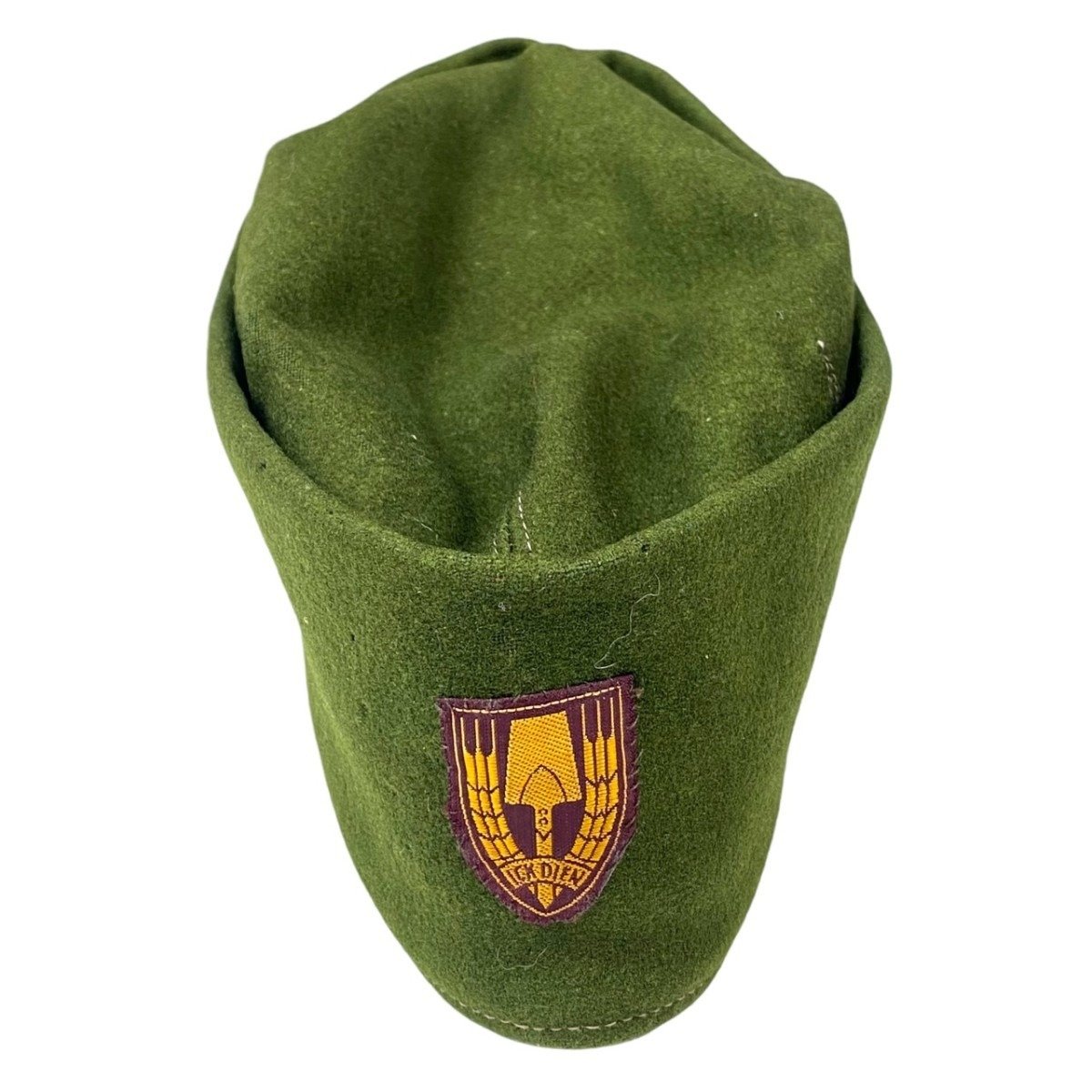 The side cap is in used condition and was worn by a member of the Dutch Labor Service during World War II.