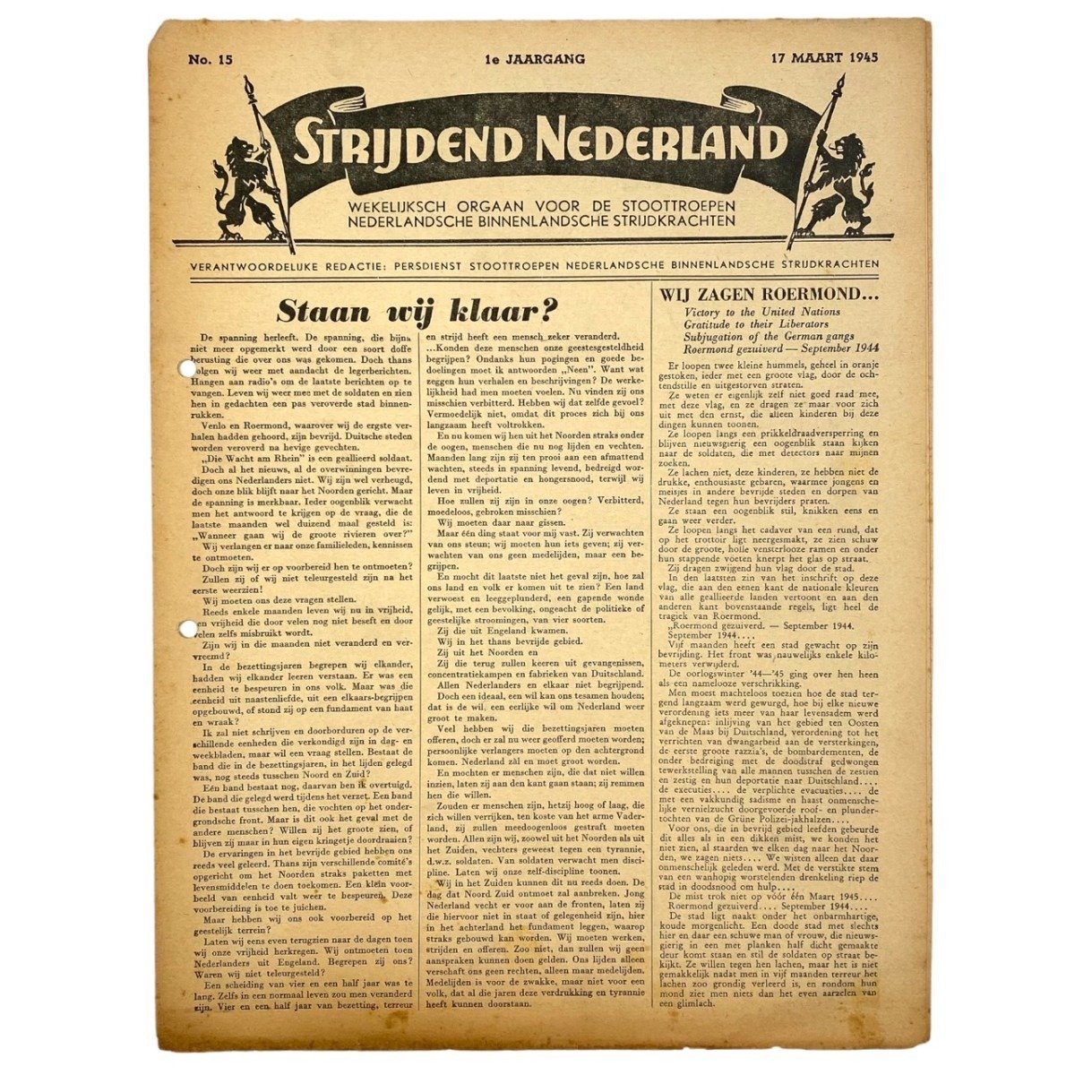 The 'Strijdend Nederland' newspaper is in used condition, dates from March 17, 1945 and was produced for the Stoottroepen of the Dutch Internal Defense Forces.