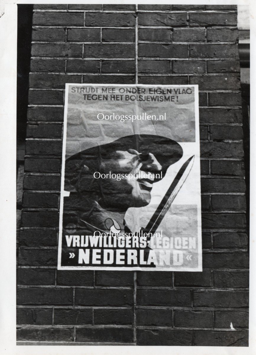 De foto is in goede conditie en daarop is de poster van het Nederlandse vrijwilligers legioen te zien.