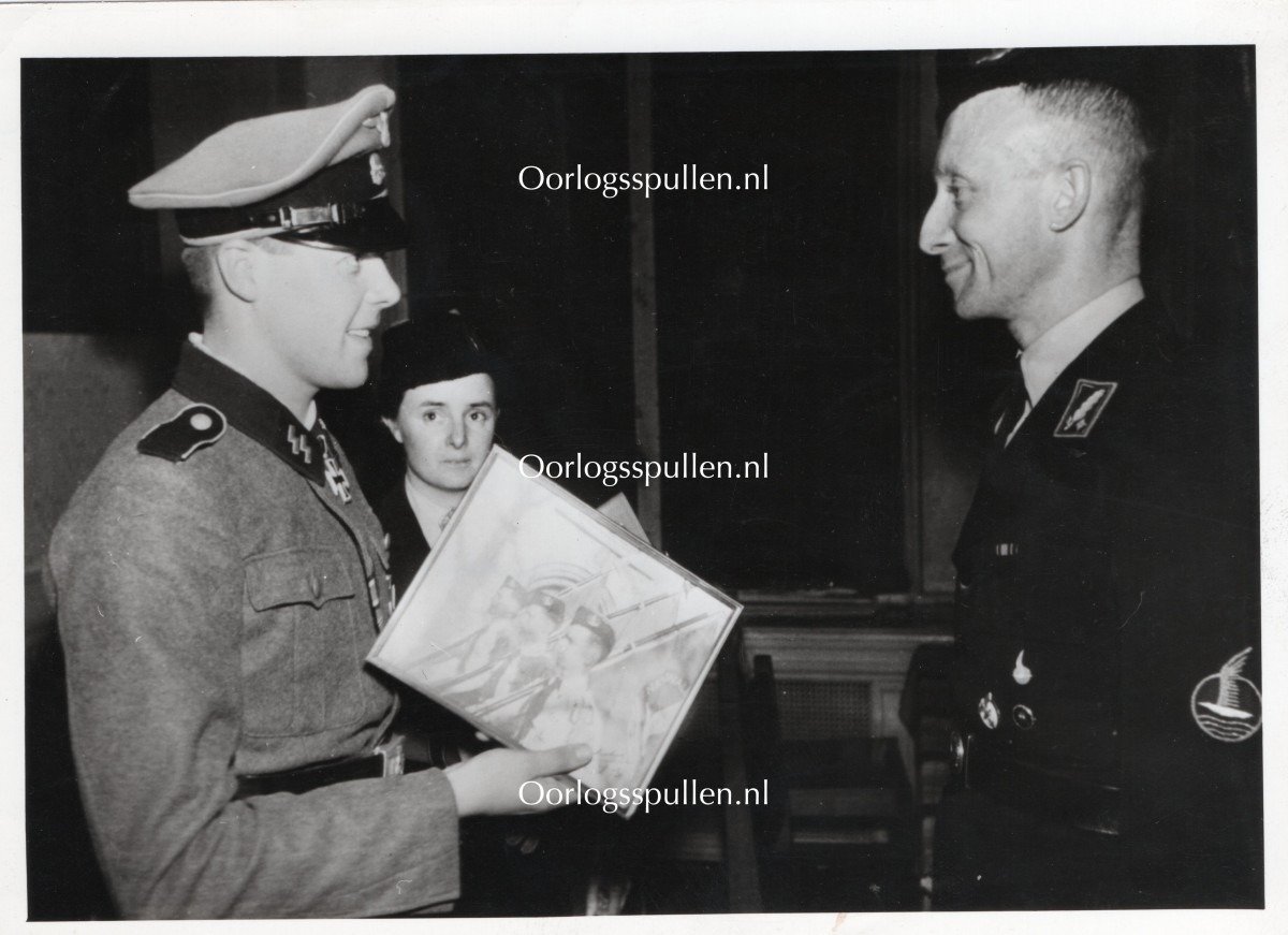 De Nederlandse Waffen-SS foto is in goede conditie en daarop is de Nederlandse Waffen-SS vrijwilliger en Ridderkruisdrager Gerardus Mooyman te zien samen Jeugdstorm stafleider Quispel en Opperzwermleidster Lien van Eck.