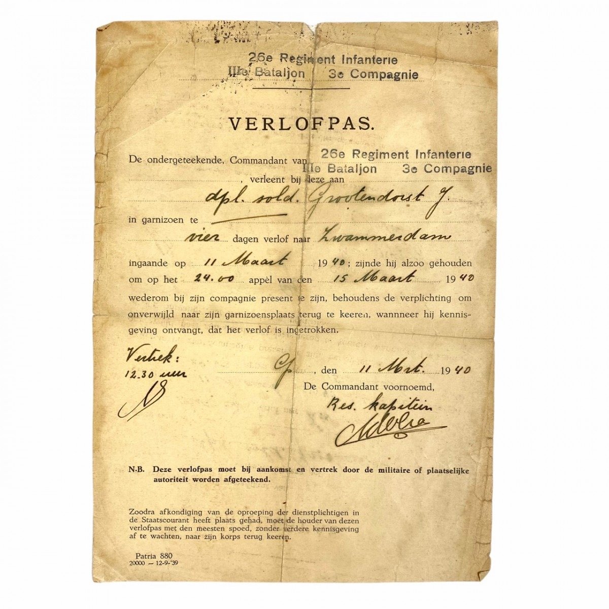 Original Pré 1940 Dutch army leave pass 26 R.I. Zwammerdam