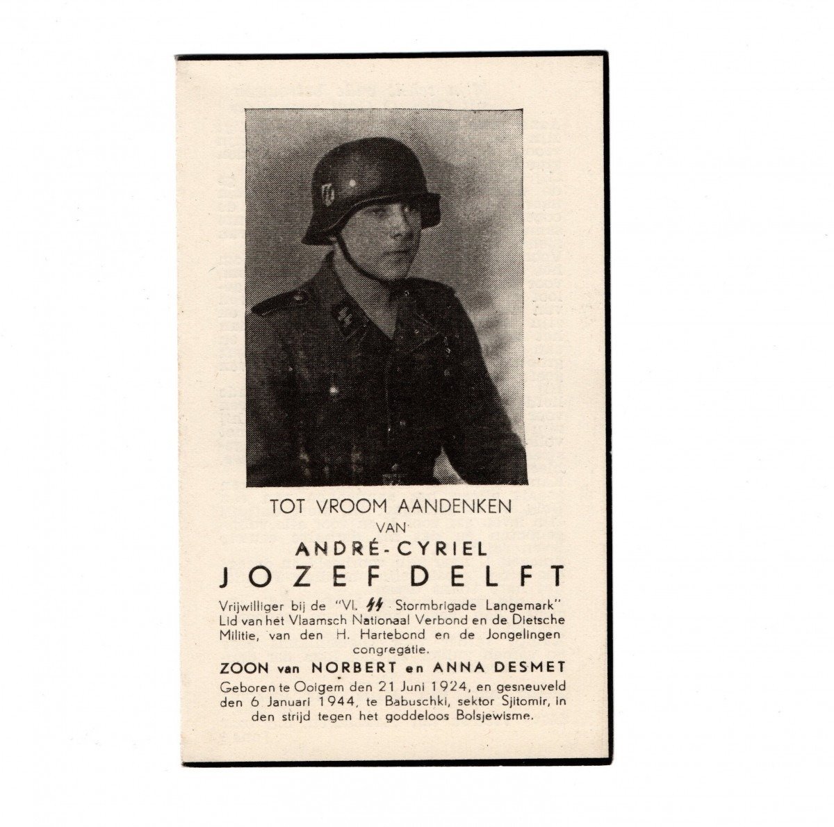 The death card is in good condition and belonged to a Belgian Waffen-SS volunteer in the 6. SS-Freiwilligen-Sturmbrigade Langemarck cuff title. (André-Cyriel Jozef Delft).