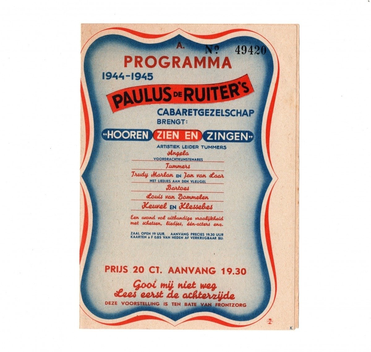 De programma flyer is in goede conditie en werd gebruikt voor de W.A. Frontzorg actie 1944-1945.