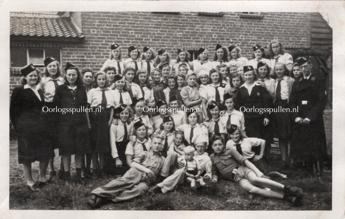 De foto is in goede conditie en daarop is een groep (meisjes) leden van de Nationale Jeugdstorm te zien.